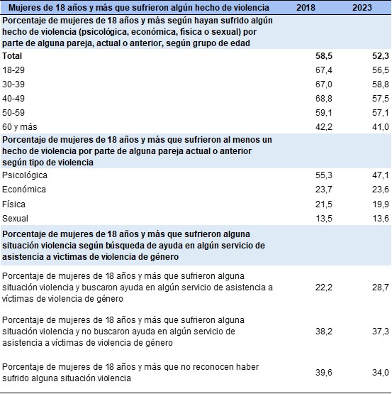 En 2018, el 59% de las mujeres encuestadas, había sufrido algún hecho de violencia durante su vida por parte de una pareja actual o pasada; porcentaje que se reduce apenas a 52,3% en 2023.