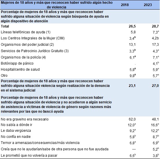 Sin embargo, solo 2 de cada 10 mujeres que reconocen haber vivido situaciones de violencia física, psicológica o sexual a lo largo de sus vidas, recurrieron a una institución pública para buscar ayuda. En estos casos, los organismos del poder judicial son el principal recurso señalado por las mujeres (menos del 13,1%, en 2018 y 27,3%, en 2023). Los servicios de patrocinio jurídico14 y los Centros Integrales de la Mujer (CIM) son los menos utilizados entre las mujeres encuestadas.